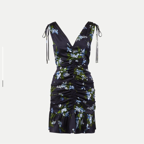 Elegant black mini dress with floral print. Features ruched detailing and tie straps. Brand new with tags, was final sale but didn’t fit