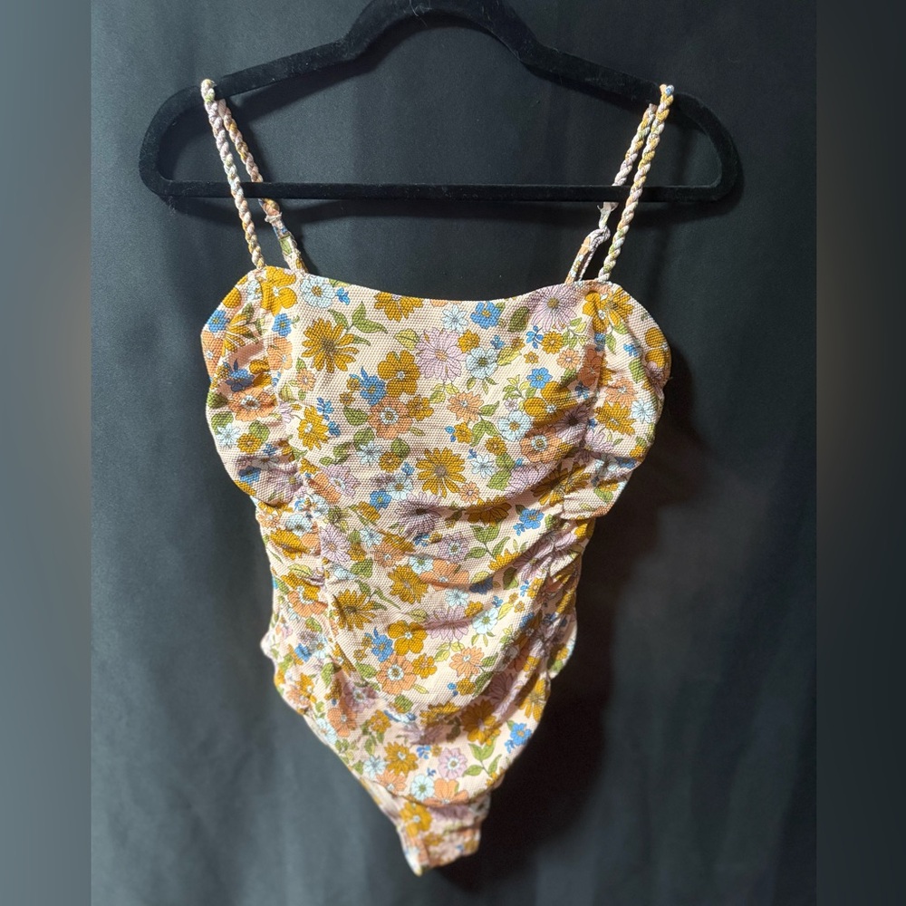 Chic floral ruched swimsuit with adjustable straps. Features a vibrant floral pattern.
