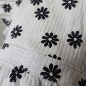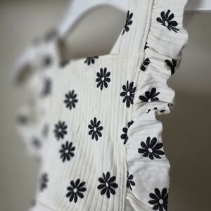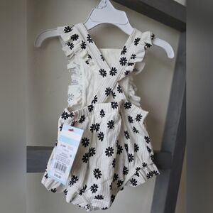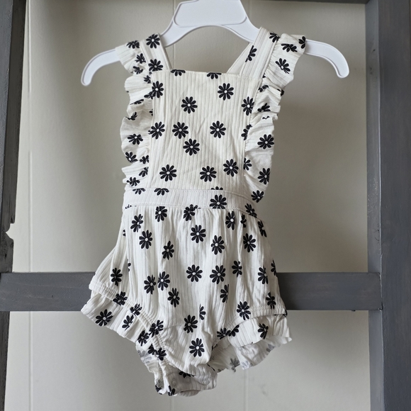 Adorable baby romper with black floral pattern. Features ruffle details for a cute look. great for Christmas presents! it has easy access to diaper changing and adjustable straps!