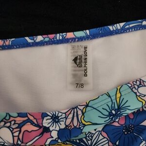 Vibrant floral bikini set with ruffle sleeves. Features blue, pink, and yellow flowers.