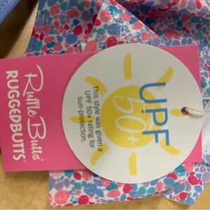 NWT Ruffle Butts floral ruffle bikini set. Features a colorful top with a blue bottom.