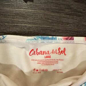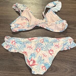 Chic bikini set with floral print and ruffle details. Features pink and blue hues. Elastic is worn/crunchy. No bra pads included.