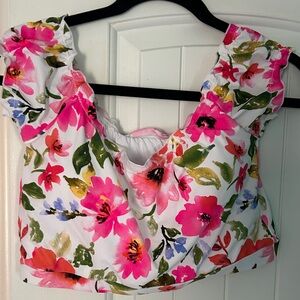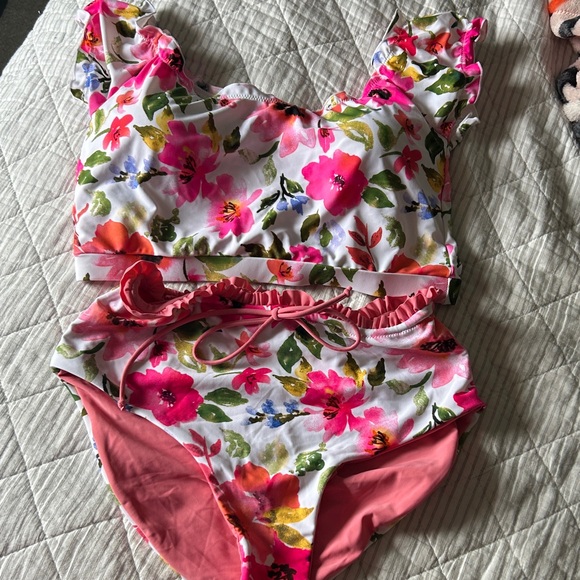 Embrace summer with this vibrant floral bikini set. Featuring a colorful design with ruffle details, it's perfect for a day at the beach. Removable pads and full coverage bottoms