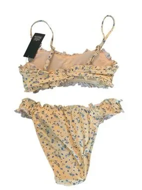 Chic two-piece bikini set with delicate ruffle trim. Soft yellow fabric printed with small blue floral accents. Adjustable straps for a comfortable, customizable fit. Lightweight stretch material for everyday wear and easy drying. Feminine, flirty style perfect for beach or pool days.