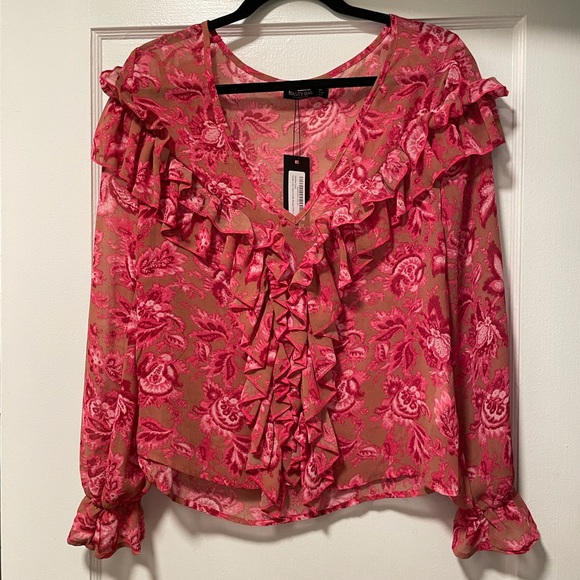 Fabric: 100% Polyester. semi-sheer chiffon and features a V-neckline with ruffle detailing, baroque design, relaxed silhouette, and poet sleeves.