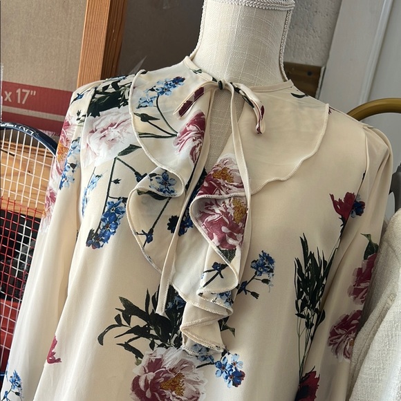 Elegant blouse with floral print and ruffle details. Features a tie-neck design.