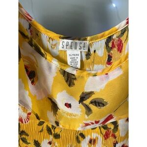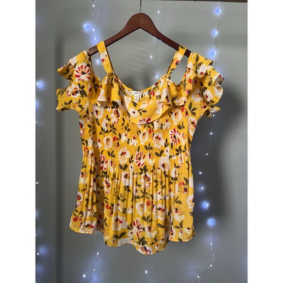 Vibrant yellow blouse with floral print. Features playful ruffles and cold shoulder design. Ideal for casual outings.Runs big. Lots of stretch. Very flattering!