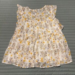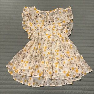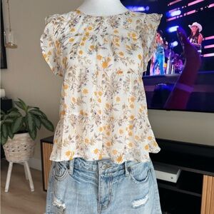 Charming floral blouse with ruffle sleeves. Features a mix of yellow and purple flowers on a cream background great for spring! Preloved in excellent condition