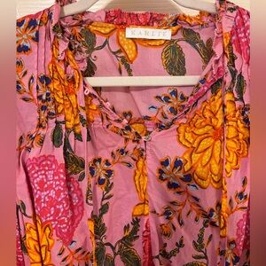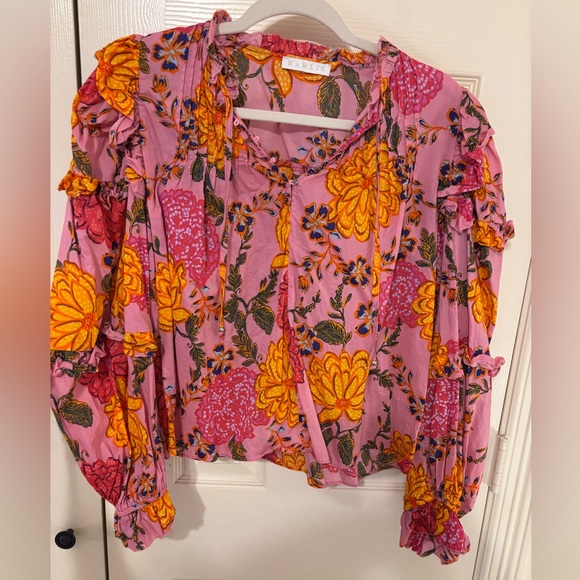 Vibrant floral blouse with ruffle details. Features pink, yellow, and orange hues.