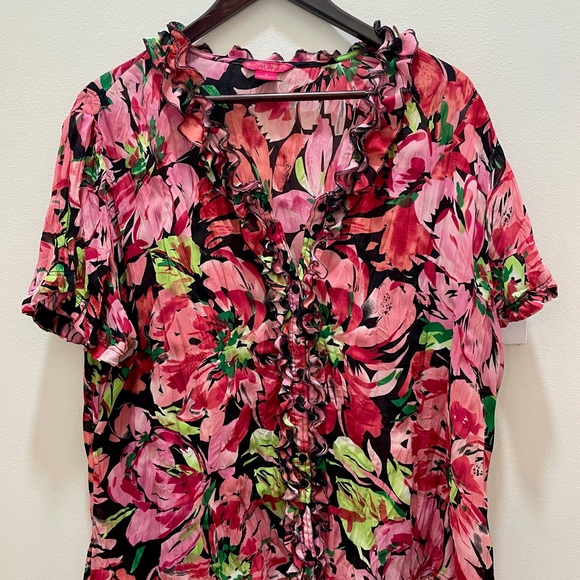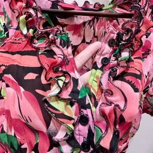 Embrace vibrant style with this floral, crinkle ruffle blouse. Perfect for any occasion, this top features a lively pink, black, green pattern. Super fun with a light camisole or tank underneath. Short-sleeve.
