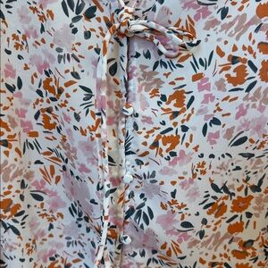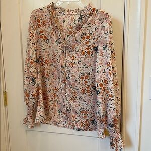Chic floral blouse with ruffle details. Features a tie-front design and button loop front closure. Perfect for any occasion.