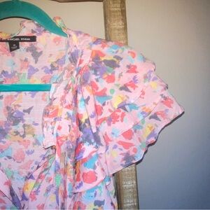 Chic floral blouse with ruffle sleeves. Perfect for a stylish look.