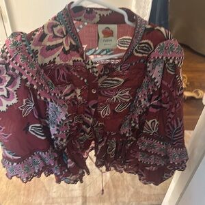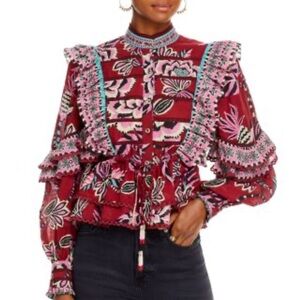 Elevate your style with this stunning floral ruffle blouse. Featuring vibrant red hues and intricate patterns, this top is perfect for any occasion. Pair it with your favorite jeans for a chic look.