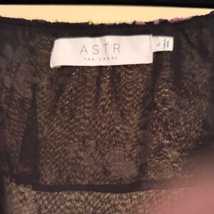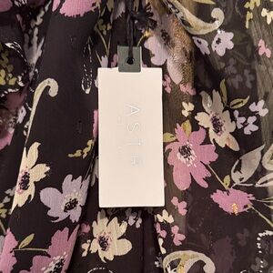 ASTR Chic floral bodysuit with ruffle details. Features a blend of purple and black hues.