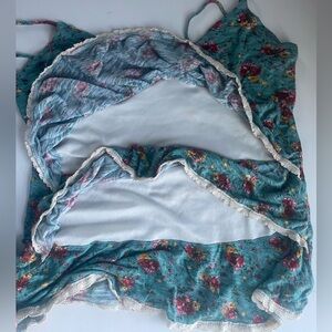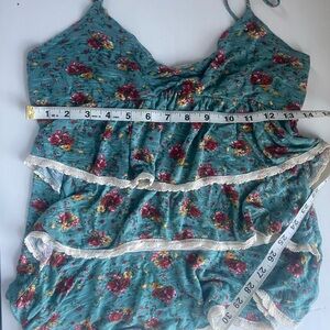 Vintage Charming camisole top with floral print and ruffle details. Features a lovely blue base with red and cream accents.