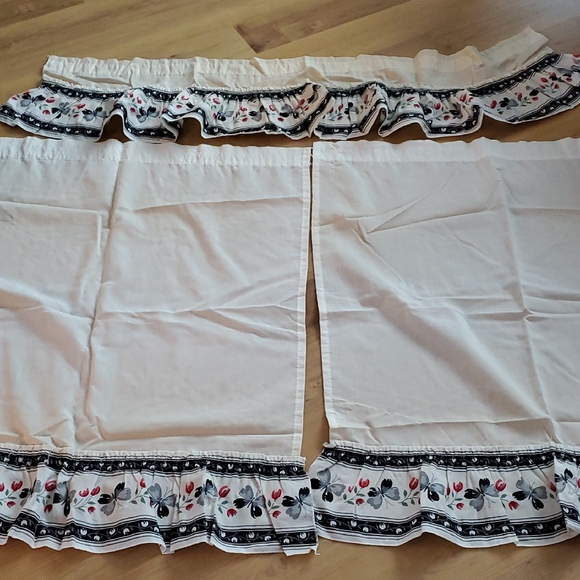 3 pieces Kitchen curtains with floral ruffle design. Features a charming black and white pattern with colorful accents.