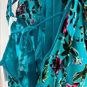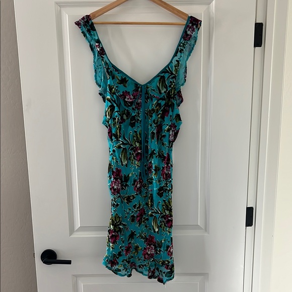 Vibrant floral dress with ruffle details. Sleeveless design. Perfect for summer outings.