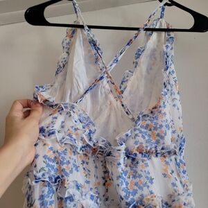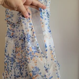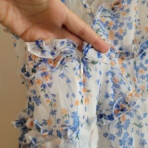 Embrace elegance with this floral ruffle dress. Perfect for any occasion, it features a beautiful blue and orange floral pattern on a white background.