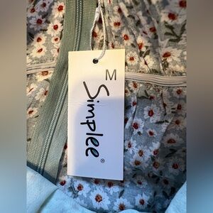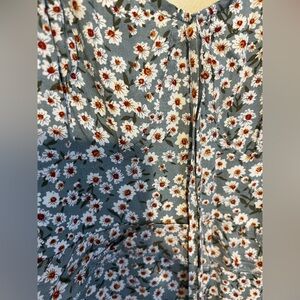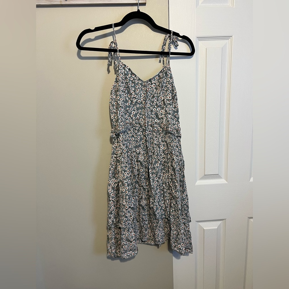 Floral ruffle blue-green dress with tie straps and bow tie in front. New with tags, never worn before!