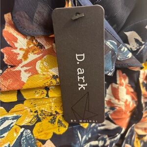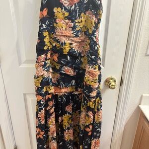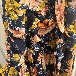 Elegant floral dress with ruffle details. Features a mix of pink, yellow, and blue hues.