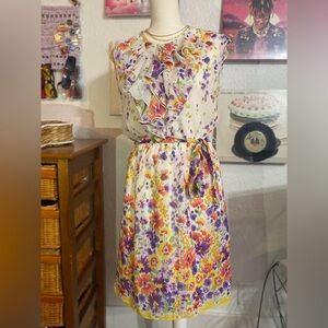 Embrace elegance with this floral ruffle dress. Featuring vibrant purple, orange, and yellow hues, it's perfect for any occasion.