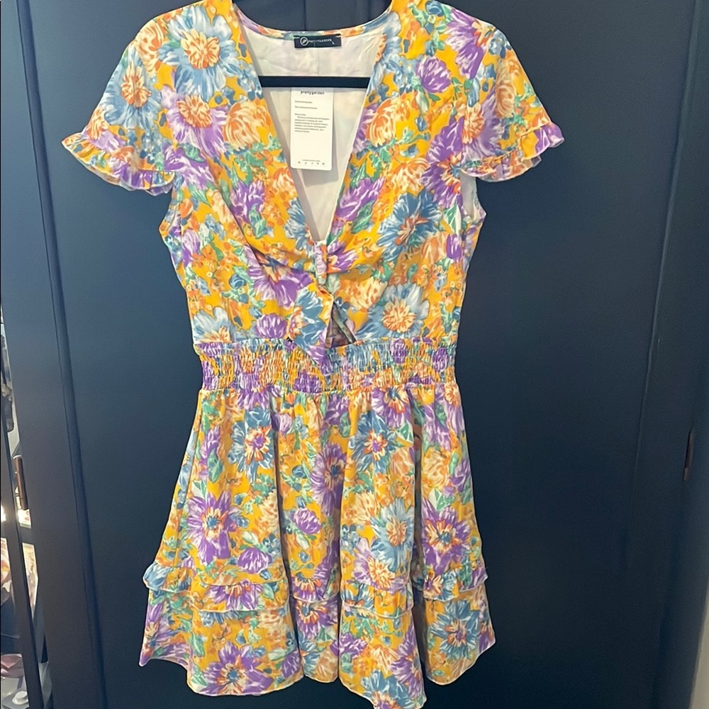 Vibrant floral dress with ruffle details. Features a mix of purple, yellow, and blue flowers. Perfect for a sunny day.
