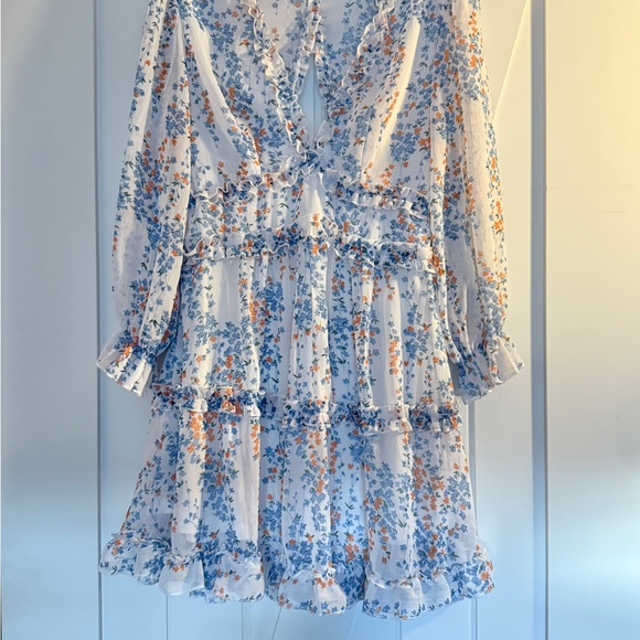 Charming floral dress with ruffle details. Features a mix of blue and orange flowers on a white background.