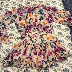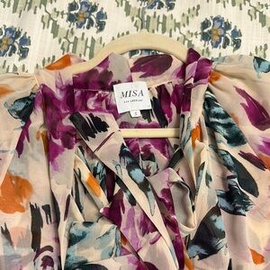 Chic floral dress with ruffle details. Misa Los Angeles great condition size small. Features vibrant purple, orange, and teal hues.
