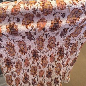 Charming off the shoulder floral dress with ruffle details. Features a mix of orange, brown, and cream colors. Never worn. Stretchy fabric.