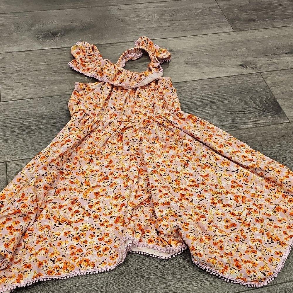 Charming floral dress with ruffle details. Perfect for a sunny day.