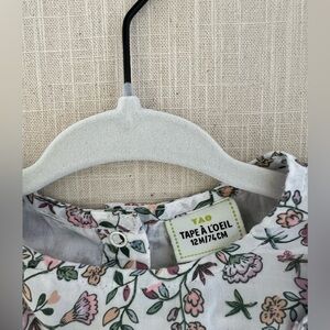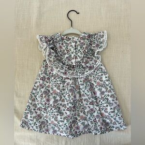Charming floral dress with ruffle details. Features a mix of purple, pink, and green floral patterns on a white background.
