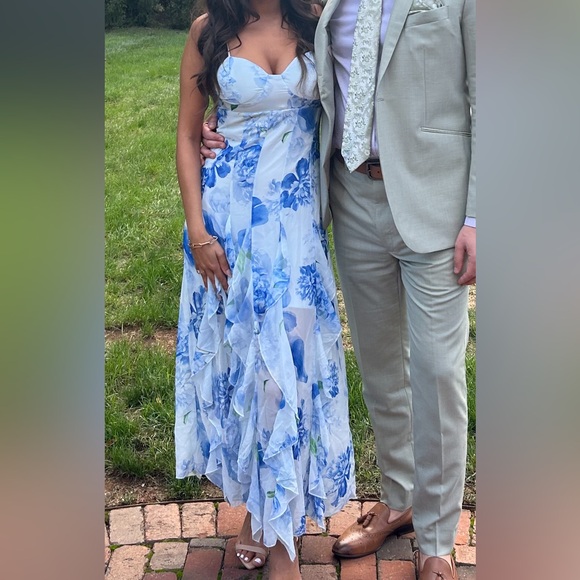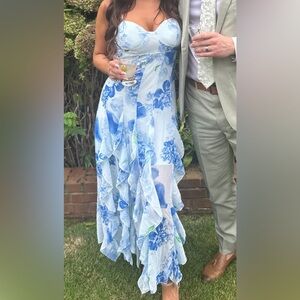Light Blue Floral & Ruffle Maxi Dress with a slit. Size small. Worn once for a wedding.
