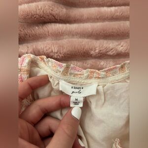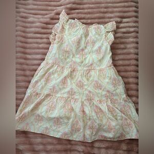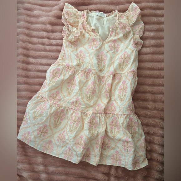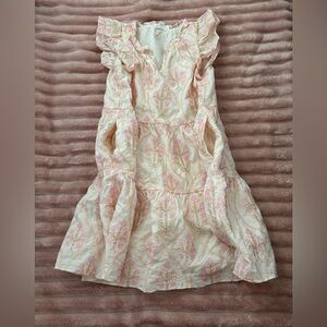 Charming floral dress with ruffle sleeves. Features a pink and cream pattern. Perfect for special occasions or church.