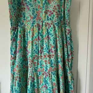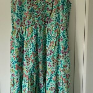 New Without Tags. Vibrant floral, midi dress with ruffle details. Perfect for a fresh, colorful look. 100% cotton, with a 100% cotton lined skirt. From a smoke free home.