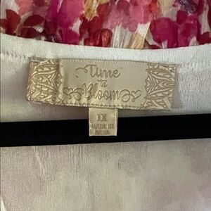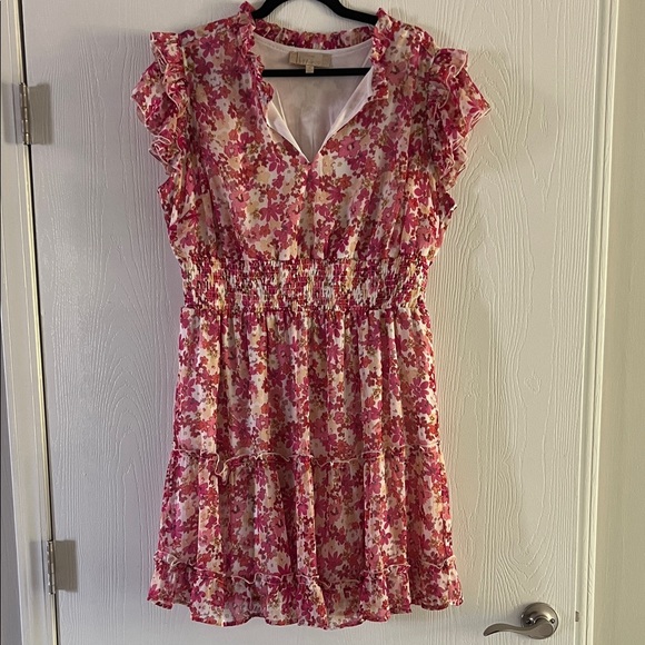 Charming floral dress with ruffle details. Features a pink and white pattern. Smoke free home.