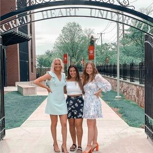Charming floral dress with ruffle details. Features a mix of blue and orange flowers on a white background. I wore it for my college graduation