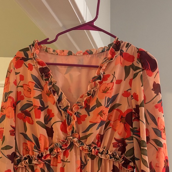 Chic floral dress with ruffle details. Features vibrant orange and red flowers.