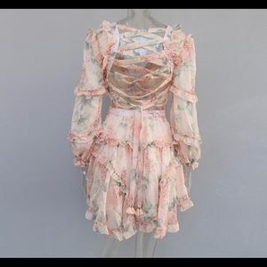 Embrace elegance with this floral ruffle dress, featuring a delicate pink and cream design. Perfect for any occasion.