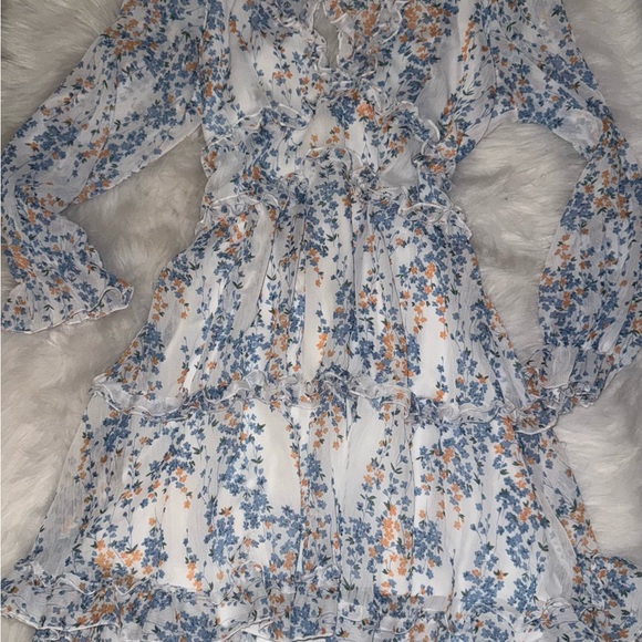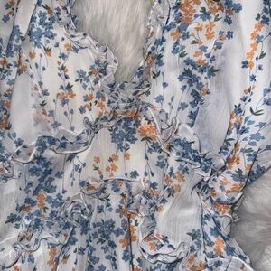 Charming floral dress with ruffle details. Features a mix of blue and orange flowers on a white background. Low cut neckline and keyhole back with button detailing behind the neck