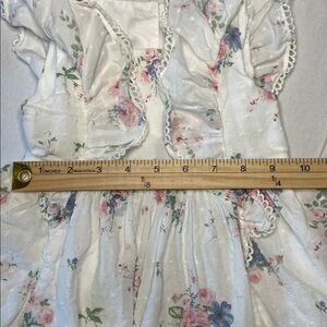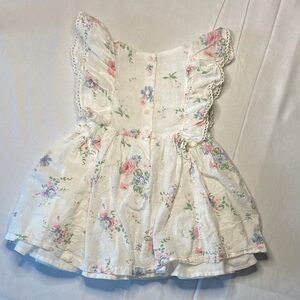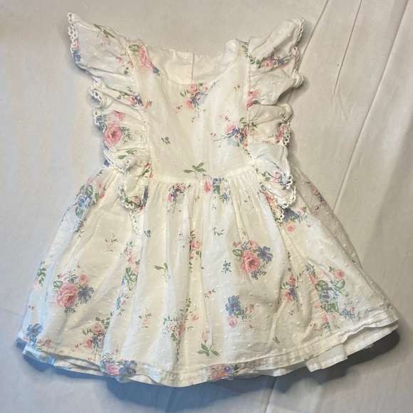 Charming floral dress with ruffle sleeves. Features pink and blue flowers on a white background.