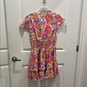 Vibrant floral dress with ruffle sleeves. Perfect for a summer outing.