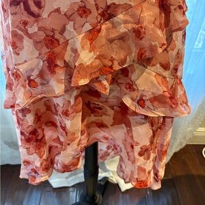 Embrace elegance with this floral ruffle dress, perfect for any occasion. The vibrant red hues add a touch of sophistication. This dress was purchased at Nordstroms, is new with tags, is a “hi-low” and perfect for spring and summer.