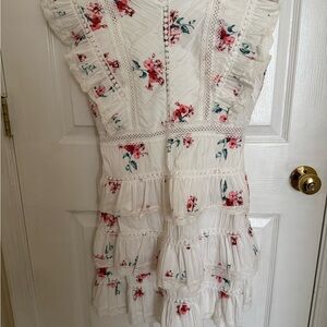 White dress with red floral pattern and ruffle details. Perfect for a summer day. Size L but it could fit M.