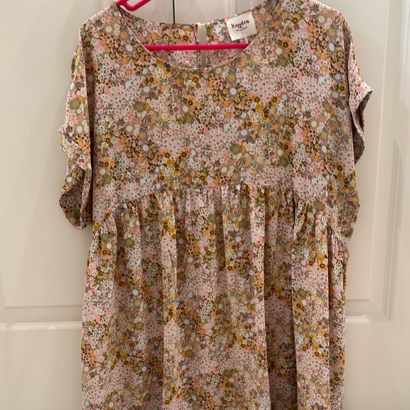 Charming floral dress with ruffle details. Features a mix of pink, yellow, and brown flowers.