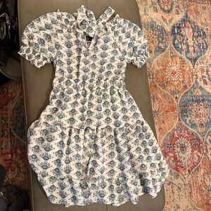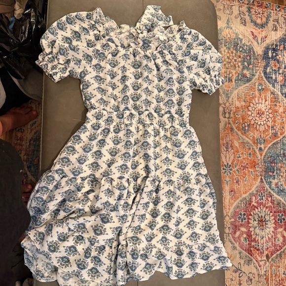 Charming floral dress with ruffle details. Features a blue and white pattern.
