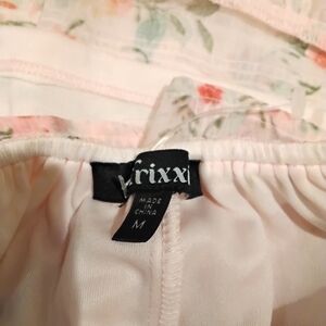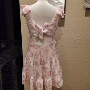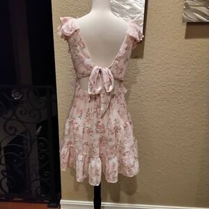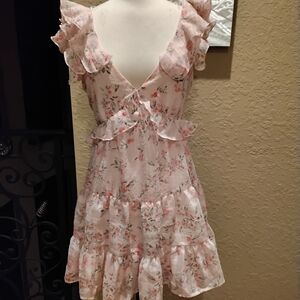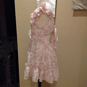 Charming floral dress with ruffle details. Features a soft pink and cream color palette.