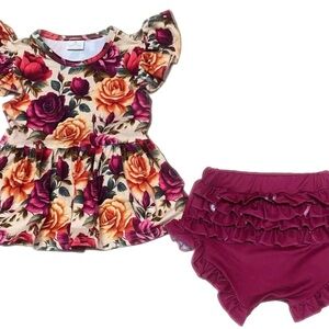Adorable floral ruffle dress set for kids. Ruffle bum. Featuring vibrant pink, maroon, coral, and plum hues. Perfect for any occasion. Exclusive custom design.