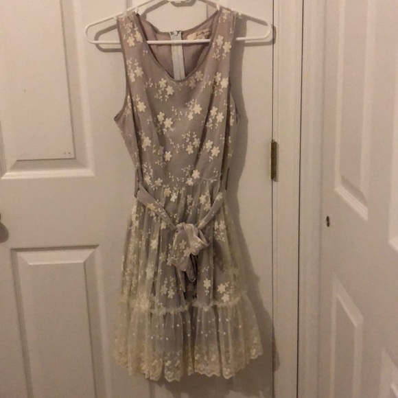 Floral, ruffle sleeveless dress with taupe background and cream embroidery. Lace trim and bow.