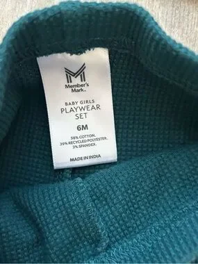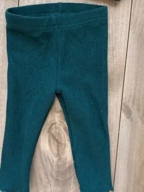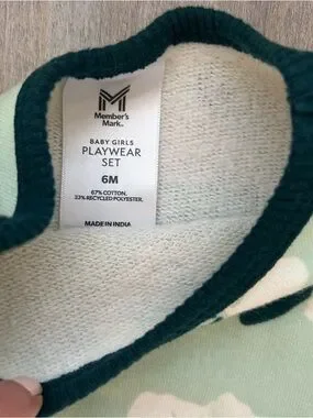 Two-piece kids matching set featuring a mint green floral pullover with ruffle details and dark green ribbed leggings. Soft, stretchy fabric for comfortable all-day wear. Elastic waist leggings for easy on and off. Mint green top with white floral print pairs perfectly with dark green bottoms for a coordinated look.