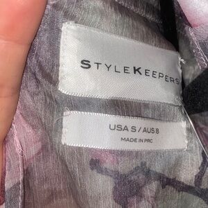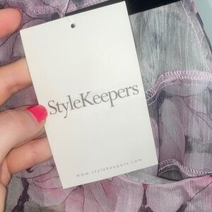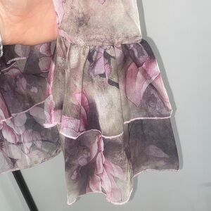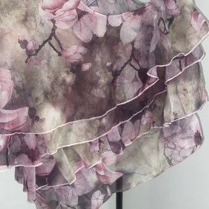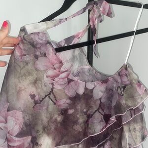 Elegant floral ruffle halter top with a beautiful blend of pink and gray hues. Perfect for a stylish and feminine look.